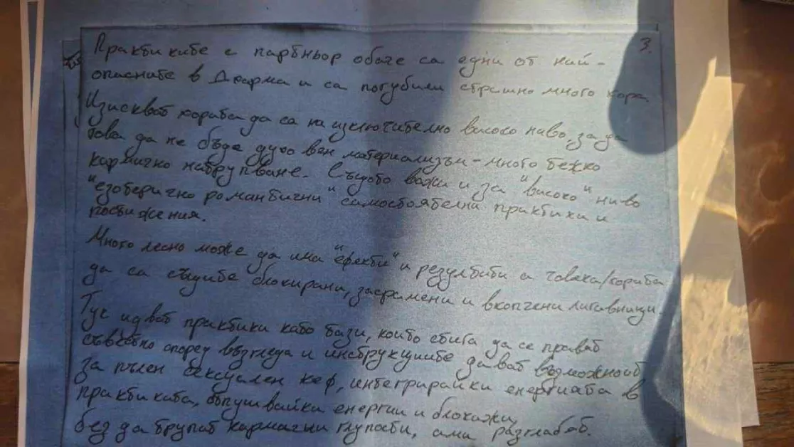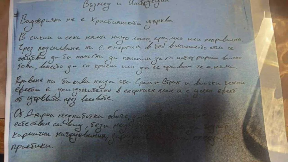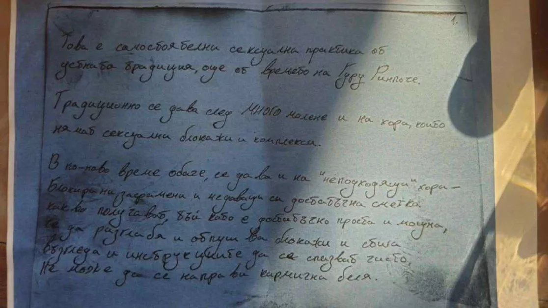 При обиските в хижата са открити много бележки, които по първични данни принадлежат на лидерът на групата Ивайло Калушев. Една от тях е озаглавена " Възход и Инструкции ". " В чикии и секс няма нищо срамно или неправилно. Чрез укрепване на половата сила в теб в предишното съм се опитвал да да ти оказа помощ да желая да го интегрираш всичко това, вместо да го криеш или да се правиш че я няма. Правенето на такива неща със Срам и Страх и всички резултати е унищожително в енергиен проект и е целен резултат от Църквата през вековете. " Друга записка, посочена " Практиката " е осияна с нарисувани фалоси, а изпод написа. " Когато човек усети желане и подтик - без задни мисли - чисто гол и фокусиран, се пречиства с три вдишвания. Визуализира дървото на убижището и без да си показва съответни хора или неща или се концентрира единствено върху половите аспекти от дървото без никакъв позор ивина с наслада и предпочитание за доста кеф и наслаждение си удари допустимо най- приятната чикия насвета. Практиките с сътрудник обаче са едни от най- рисковите в Дхарма и са погубили ужасно доста хора. Изискват хората да са на извънредно високо равнище, с цел да не бъде това нравствен материализъм - доста тежкокармично струпване. "