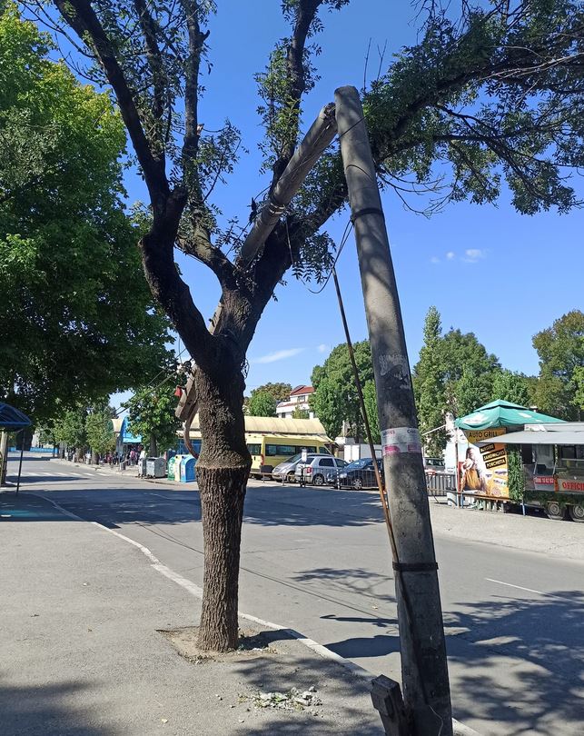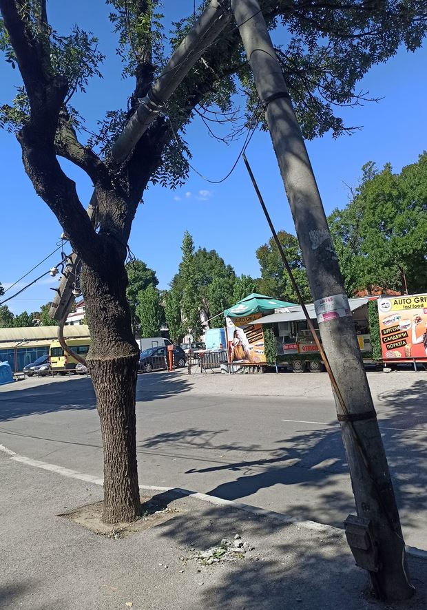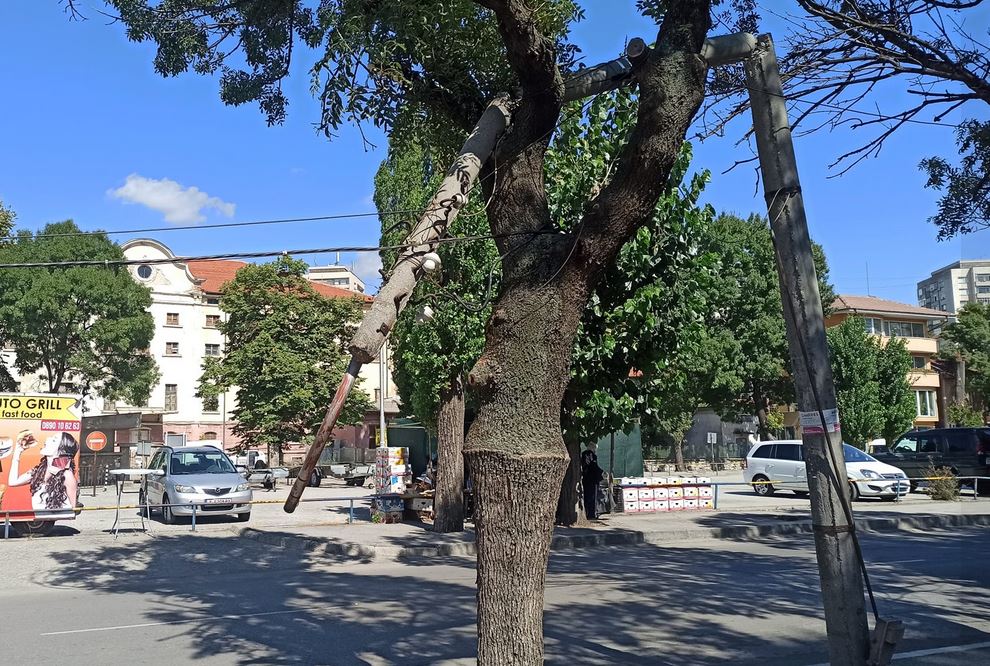 Пречупен стълб падна върху дърво, жици се крепят на стъблото СНИМКА