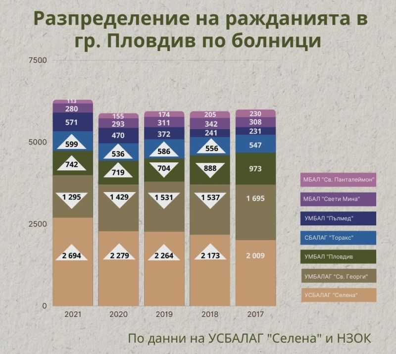 Ръст на ражданията има в съвсем всички лечебни заведения в града, демонстрират данните на НЗОК. Най-сериозно е нарастването в УСБАЛАГ „ Селена “, които регистрираха 2741 бебета за 2021 година – с 340 повече от миналата. Пловдивската болница е единствената отвън София с над 2 000 раждания за 2021 година и втора в страната по брой новородени бебета.