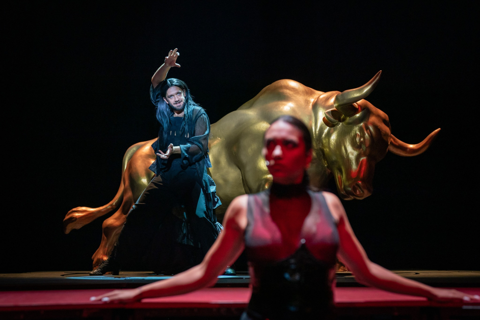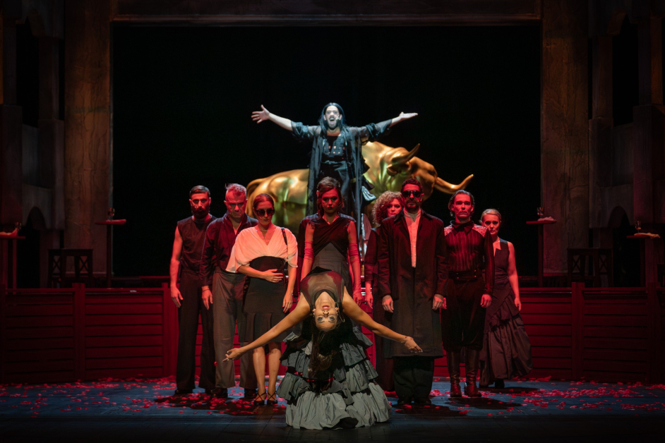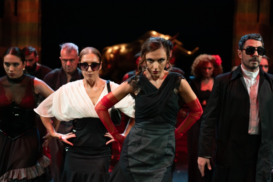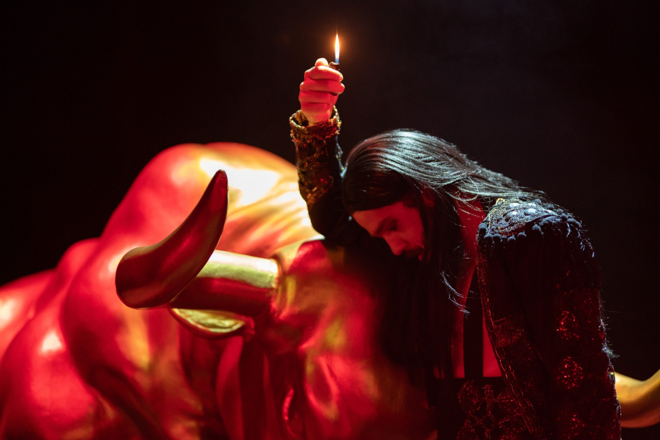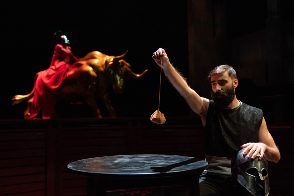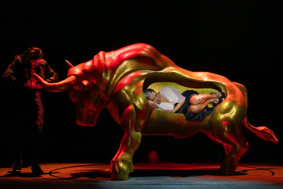 Спектакълът на Диана Добрева съчетава класическите похвати на античната драма с изключителни драматургични и образни техники. Декорът е шаблонизиран с преобладаващ златен бик в центъра на въртяща се сцена, която се трансформира поредно в сцена за корида, бар, зала за танци, полесражение, хотелска стая. Диалозите са къси, изчистени, само че в това време двусмислени до степен в който би трябвало да избираш дали да се разсмееш или да се разплачеш. Няма непотребни думи, няма комплицирани фигури.