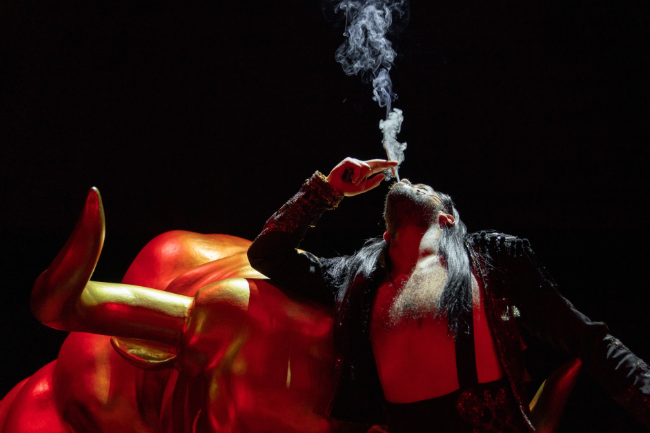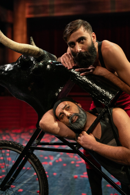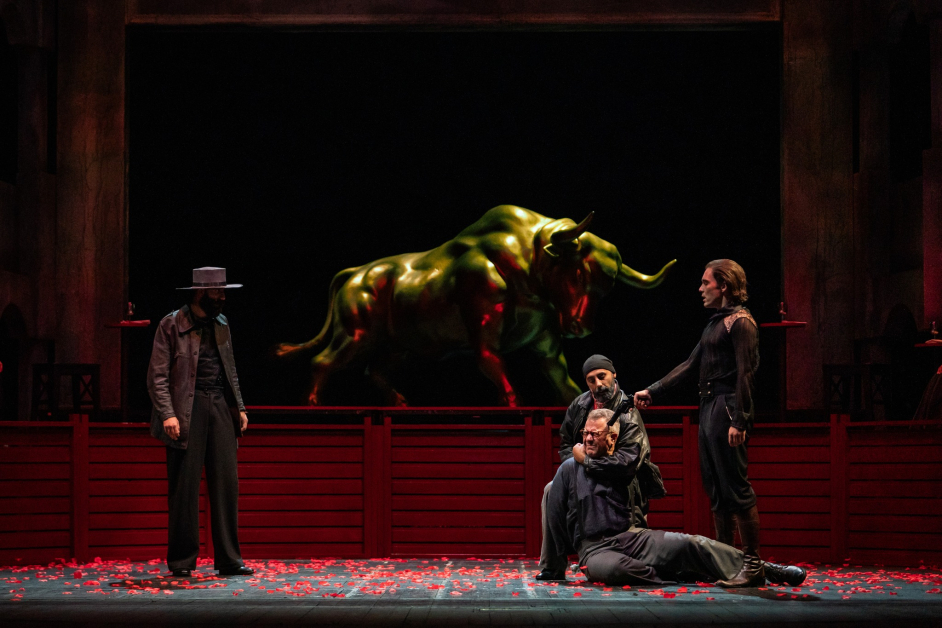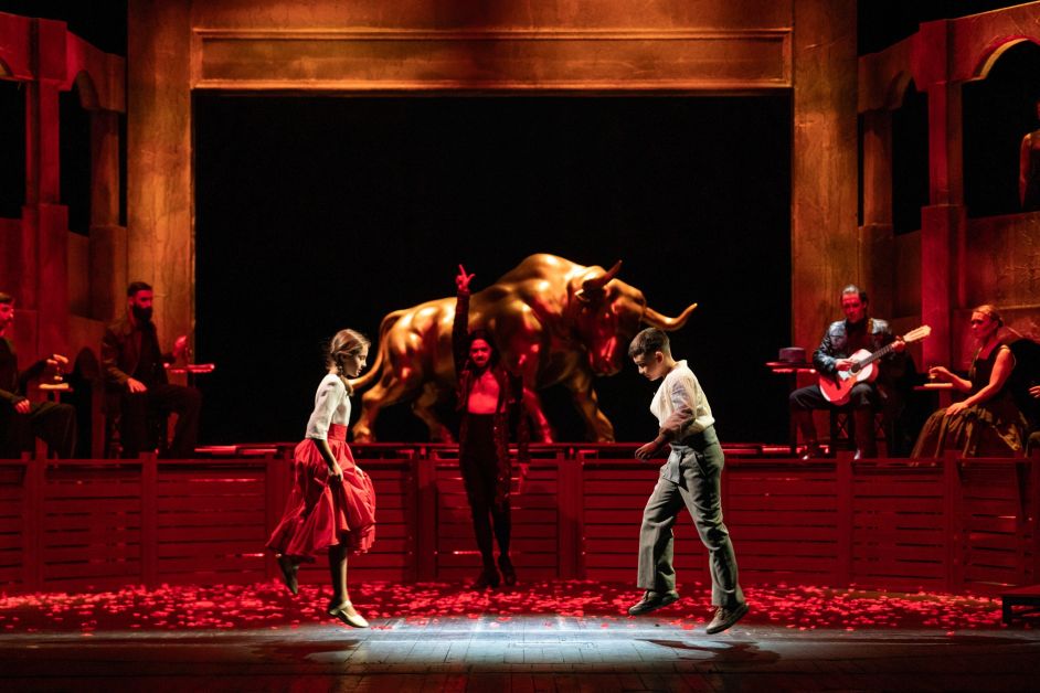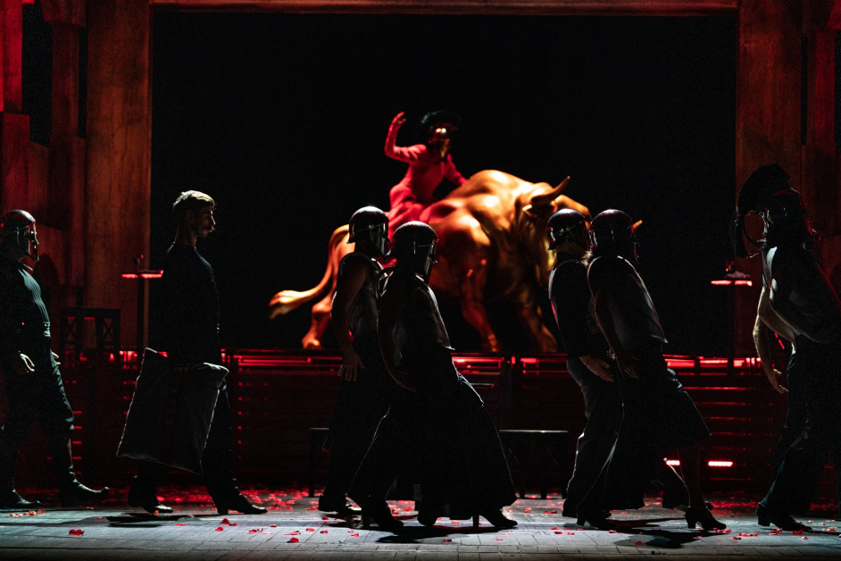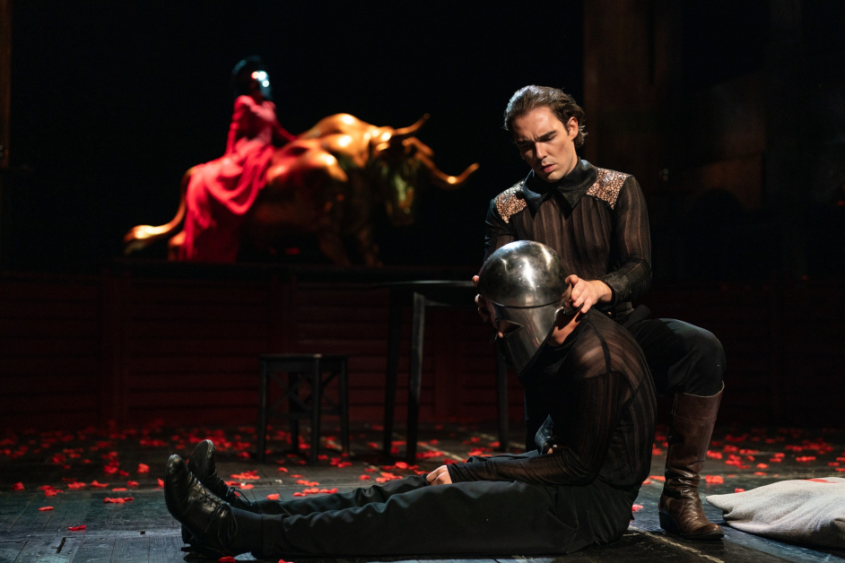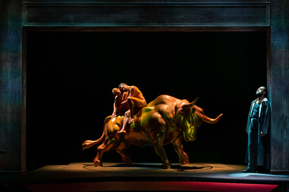 Спектакълът на Диана Добрева съчетава класическите похвати на античната драма с изключителни драматургични и образни техники. Декорът е шаблонизиран с преобладаващ златен бик в центъра на въртяща се сцена, която се трансформира поредно в сцена за корида, бар, зала за танци, полесражение, хотелска стая. Диалозите са къси, изчистени, само че в това време двусмислени до степен в който би трябвало да избираш дали да се разсмееш или да се разплачеш. Няма непотребни думи, няма комплицирани фигури.
