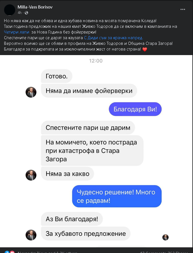 За хубавата вест заяви Milla-Vass Borisov във фейсбук профила си. Жената е предложила на кмета на Стара Загора Живко Тодоров спестените средства да отидат в помощ на потърпевшата Диана Митева, която след тежкия случай претърпя голям брой интервенции и изгуби единия си крайник.