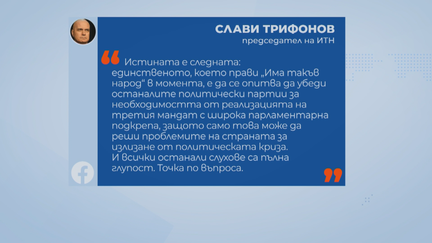 " Отговорът е доста елементарен. Първо, мисля, че живеем в свободна страна и всеки може да се среща с който реши. Предполагам сте прочели поста на господин Трифонов по тематиката. Единственото, което желаеме да създадем, е реализация на третия мандат. Ако има болшинство за това, което говорите, то ще има държавно управление ", акцентира Тошко Йорданов, Има Такъв Народ.