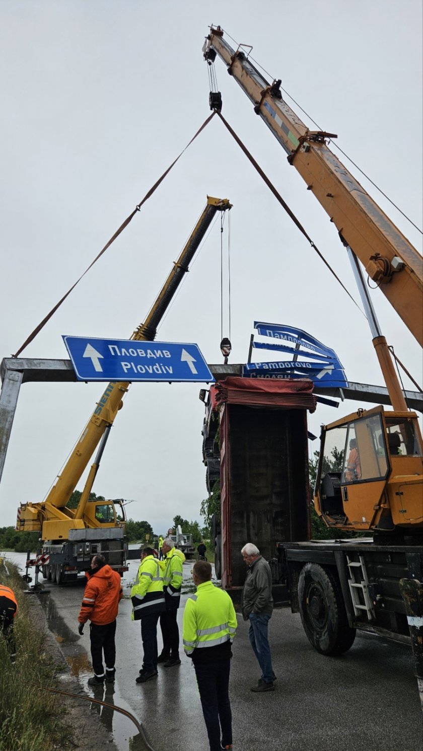 Заради зрелищния случай в продължение на часове беше спряно придвижването към Пловдив и Смолян, след слизането от автомагистрала " Тракия ". Пътят към този момент е освободен и придвижването е възобновено. Камионът е на строителна компания " Пътища " АД.