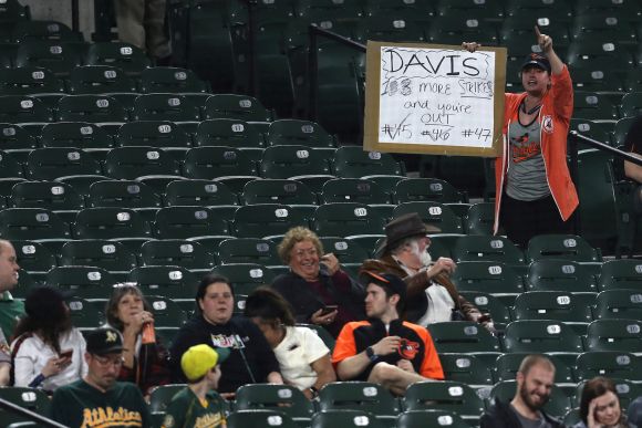 Безпрецедентната рецесия на Крис Дейвис без ударен шлагер в МЛБ продължава с цялостна мощ. Късно нощес първият бейзмен на Балтимор Ориолс батира 0 от 3 с база за боли и означи точка при домакинската загуба с 5:8 от Оукланд Атлетикс, увеличавайки абсолютния антирекорд във Висшата бейзболна лига на Съединени американски щати и Канада на 53 следващи заставания (AB) и 61 излизания (PA) без шлагер.