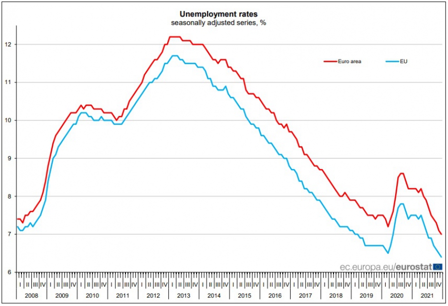 Към края на декември 2021 година, сезонна изгладената безработица възлиза на 6.4% за Европейски Съюз и 7% за страните от еврозоната. Това е намаляване по отношение на предходния месец ноември, когато безработицата е достигала надлежно 6.5% и 7.1%. Преди година безработицата бе на равнище от 7.5% за Европейски Съюз и 8.2% за страните, употребяващи еврото.