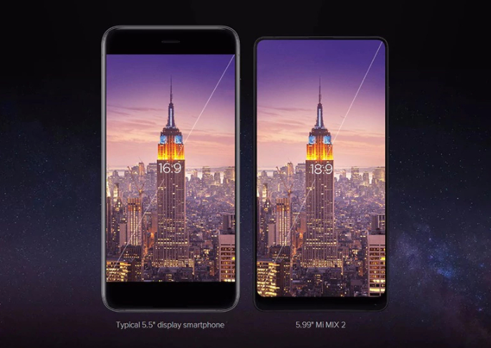 Фаблетът Xiaomi Mi Mix 2 дава огромен 5,99-инчов екран с резолюция FHD+, или 2160×1080 пиксела, със съответствие 18:9 и без рамка на три от страните (с изключение на долната) – надали може да се желае освен това от екрана на един смарт телефон. Сравнението с типичния 5,5-инчов смарт телефон демонстрира, че Mix 2 е по-компактен като размери, само че в същото време има по-голяма екранна повърхност.