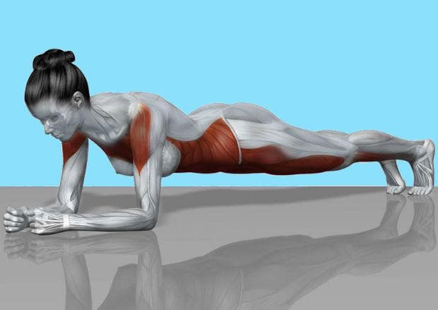 Класически планк. Легнете по стомах, изправете се на опънати ръце и пръстите на краката. Тялото ви би трябвало да е в една линия. Мускулите на пресата са напрегнати, коремът не би трябвало да провисва. За увеличение на натоварването краката са събрани. Задръжте това състояние допустимо най-дълго. Започнете с 10-20 секунди и последователно стигнете до 60.