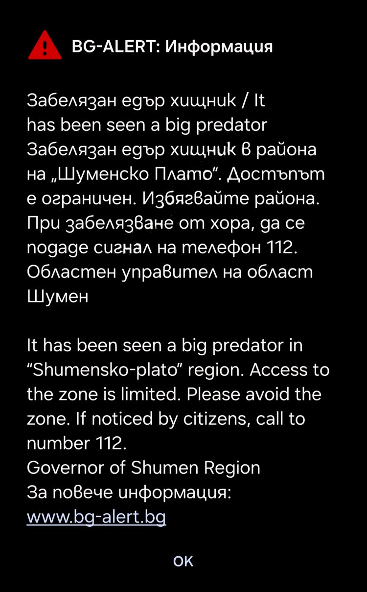 „ Забелязан наедрял див звяр в региона на „ Шуменско Плато ”. Достъпът е стеснен. Избягвайте региона. При забелязване от хора, да се подаде сигнал на телефон 112. Областен шеф на област Шумен ”, гласи известието.