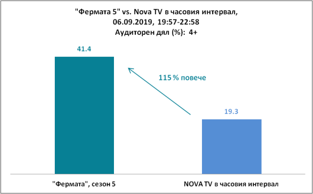 Според Би Ти Ви, шоуто им е гледано от 41,4% от всички фенове, до момента в който „ Игри на волята ” е следено от 19,3%, или от почти2,5 пъти по-малка публика. За улеснение на рекламодателите си, от Би Ти Ви са пресметнали в графиката си точния % – „ Фермата ” е гледана със 115% повече фенове от „ Игри на волята ”.