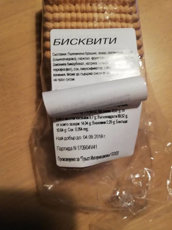 Етикетът с същинския краен период за консумация - 4 септември 2018 година, е прикрит под нов етикет, залепен от горната страна, който сочи нова дата: 25.03.2019 година