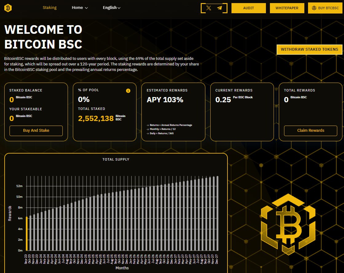 Bitcoin BSC се отличава с впечатляваща годишна рентабилност от 104% APY, което е извънредно достижение в света на криптовалутите. Този план стартира мощно с сполучлива предварителна продажба, като 69% от токените бяха заделени за стейкинг награди, което акцентира главния фокус на плана към дълготрайни и постоянни вложения.