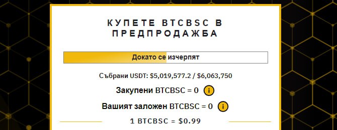 Остава малко над $1 милион до достигането на хард капа, с който и предварителната продажба дефинитивно ще завърши. Със своя голям капацитет обаче, нищо чудно Bitcoin BSC да завърши своя надвит път още в границите на идващите 2 дни.