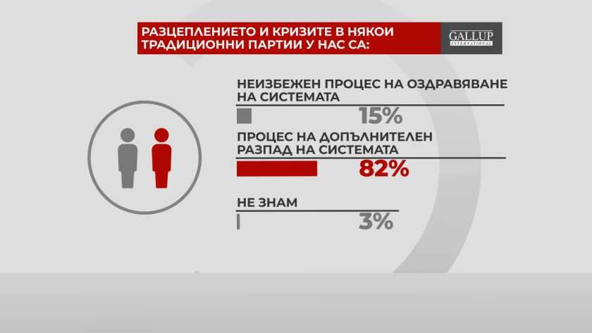 Според 82% от участниците в запитването разцеплението в някои от систематичните партии у нас е въплъщава спомагателния разпад на българската политическа система. 15% считат, че протичащото се е излекуване на системата.