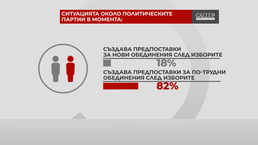 Мнозинството от интервюираните - още веднъж 82% - също по този начин е на мнение, че обстановката сред политическите партии сега значи все по-трудни разновидности за управническо обединяване след изборите. Едва 18% са на противоположното мнение.