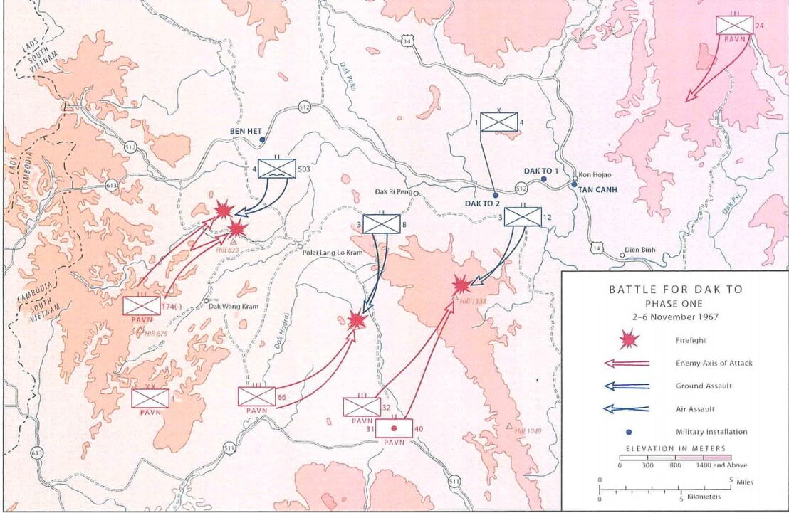 Битката за Дак То може да се счита за една от най-големите в целия Виетнамски спор. В нея са призовани 503 пехотна дивизия, 173 въздушна бригада, 4-и пехотен батальон и тяхната специфична задача е да се оправят с вражеските сили, освен това за малко време. Единственият проблем е, че в този миг Северен Виетнам няма никакви планове да се съобщи толкоз елементарно. Командването на 4-а дивизия е обещано в ръцете на майор-генерал Уилям Пиърс, в него участват 2 механизирани батальона, 8 пехотен полк, 1 и 3 батальон, 12 пехотен полк и на помощ са изпратени още към 15 артилерии и една дивизия. Сражението стартира на 3 ноември и завършва на 23 ноември, когато най-близките възвишения покрай град Дак То в провинция Контум, стартират да граничат с Лаос, Камбоджа и Южен Виетнам. С други думи, това е точката, в която трите страни се преплитат.