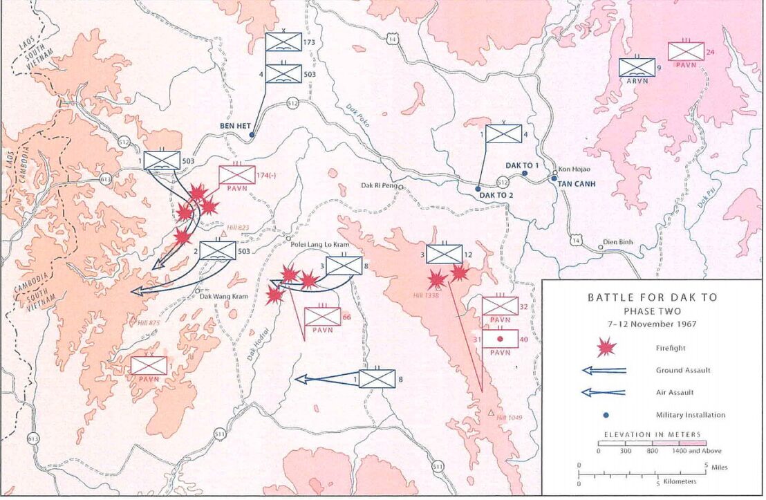 Бомбардировките унищожават бункера и на 5 ноември взвод Б съумява да се придвижи напред и да подсигури позицията си. От 6 до 14 ноември 3-ти батальон и 12-та пехота съумяват да водят пердах навън против вражеските позиции покрай възвишението Нког Кон Кринг. Именно то се намира над базата Дак То. Следва нахлуване над върховете 1124, 1089 и 1021. Там се крият доста бункери и индикацията на врага е, че счита да остане и да не напуща позициите си. Нападателите са посрещнати неведнъж от противников огън. Сражението продължава съвсем седмица, преди да се стига до изтеглянето. На 16 ноември взвод А и Ц от 3-и батальон и 12-та пехота не престават напред към връх 1338. Отново борбата се води благодарение на авиация и артилерия.