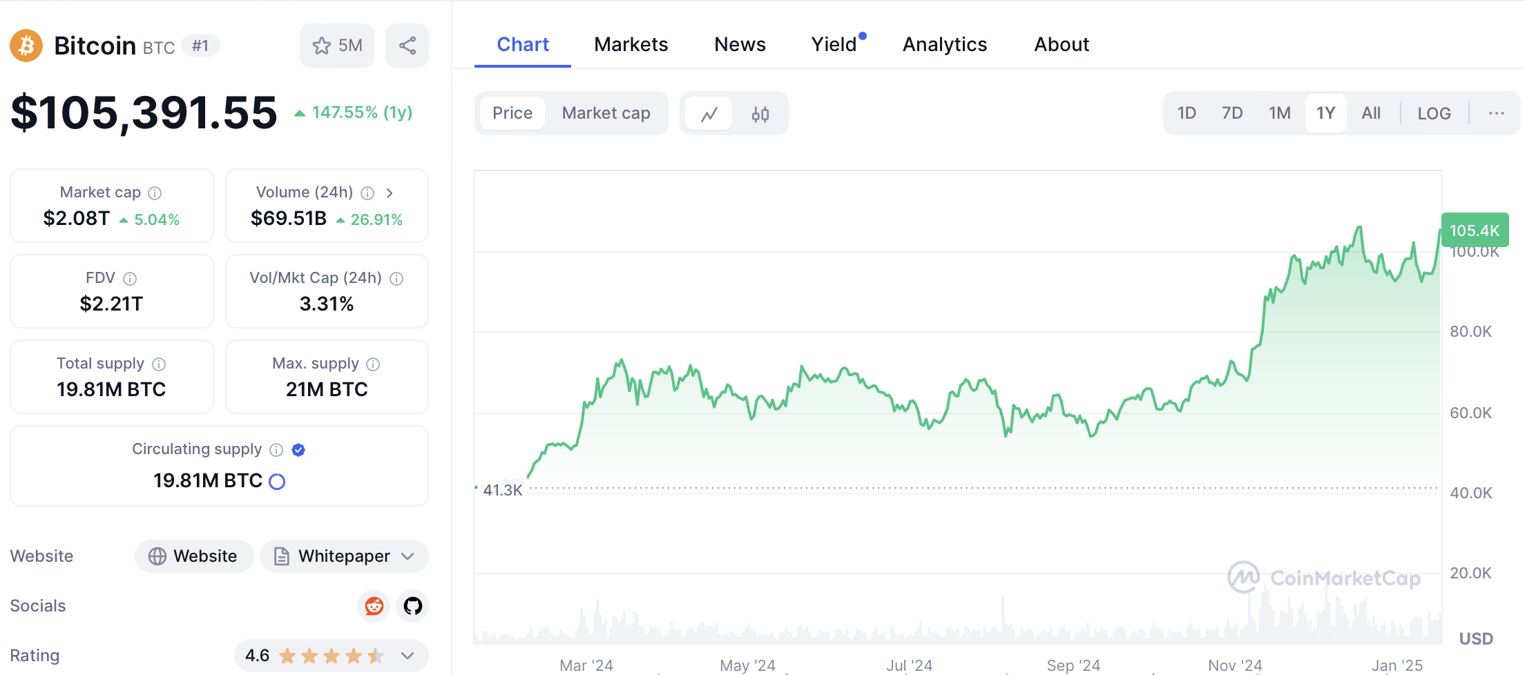 Към момента на писане на публикацията BTC се търгува на цена към $105,400, отбелязвайки най-високото си равнище от 18 декември насам, регистрирайки 10% облага за седмицата и над 140% за последната година.
