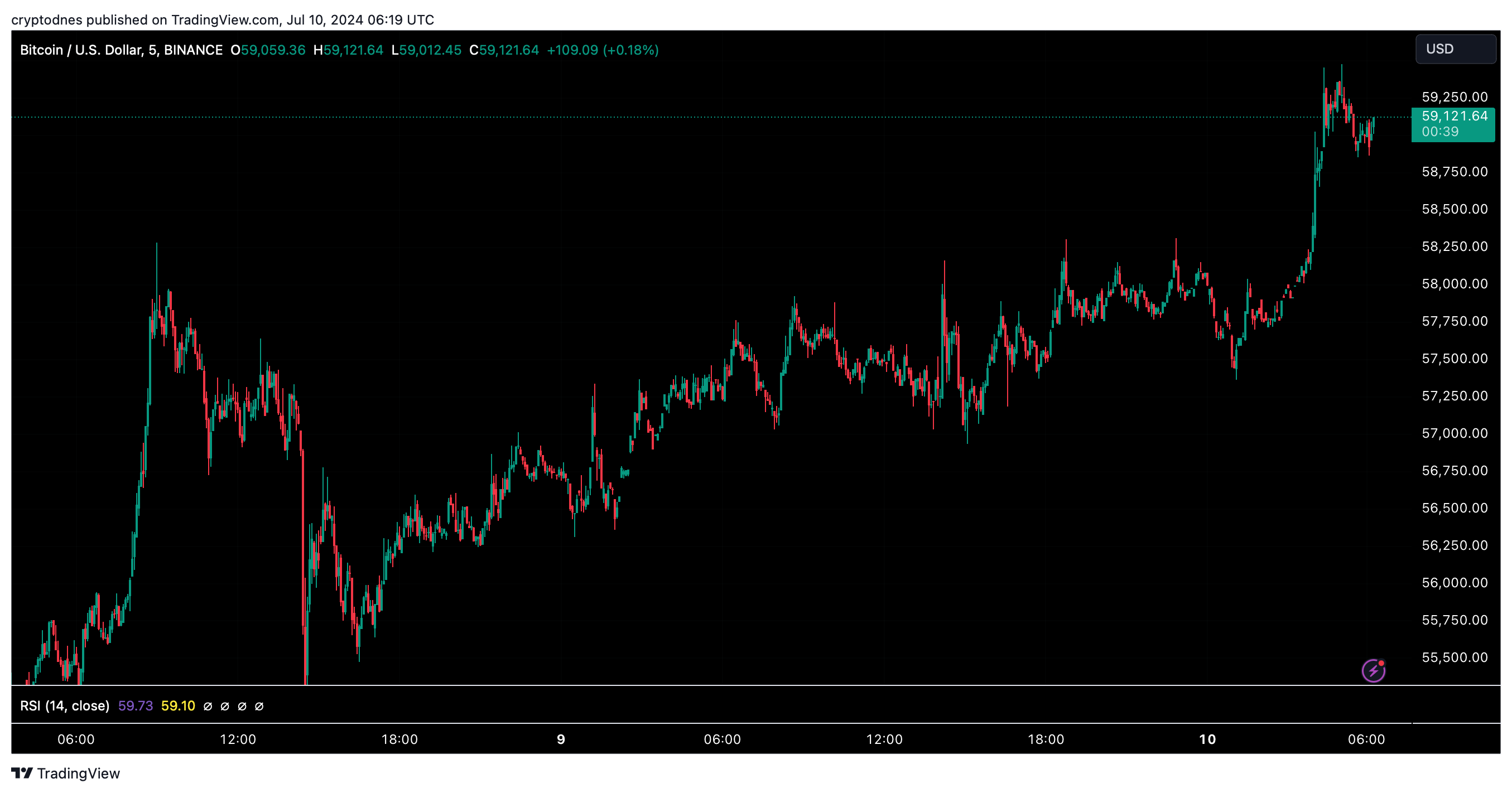 Биткойн означи растеж от 3% през последните 24 часа, достигайки $59,100 все още на писане на публикацията.