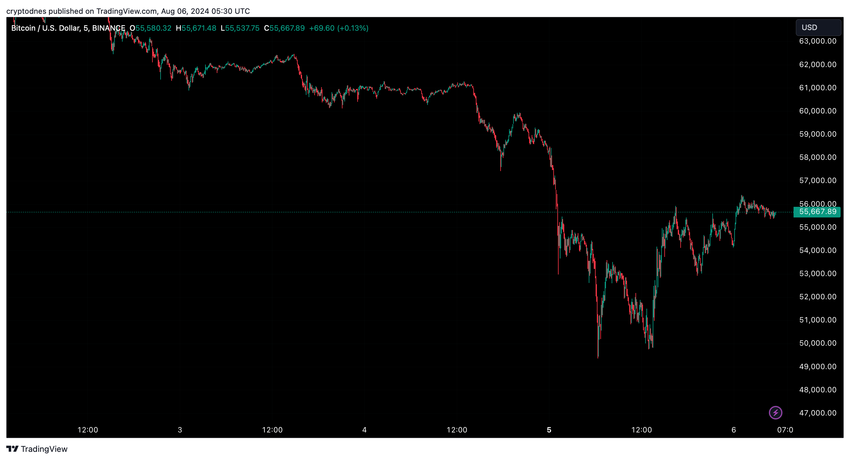 Оттогава обаче тя се възвърне i все още на писане на публикацията се търгува за $55,600, което отразява 4.5% нарастване за последните 24 часа. Освен това цената на монетата съумява да се задържи над $54,000 за последните 9 часа.