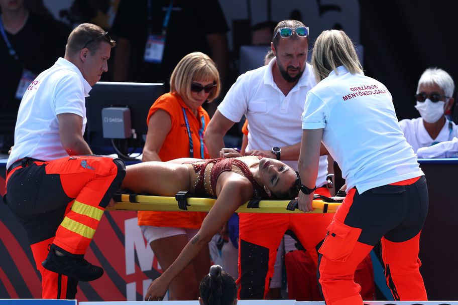 Алварес беше откарана на носилка до медицинския център на басейна, като съотборниците и почитателите изглеждаха в потрес край басейна.