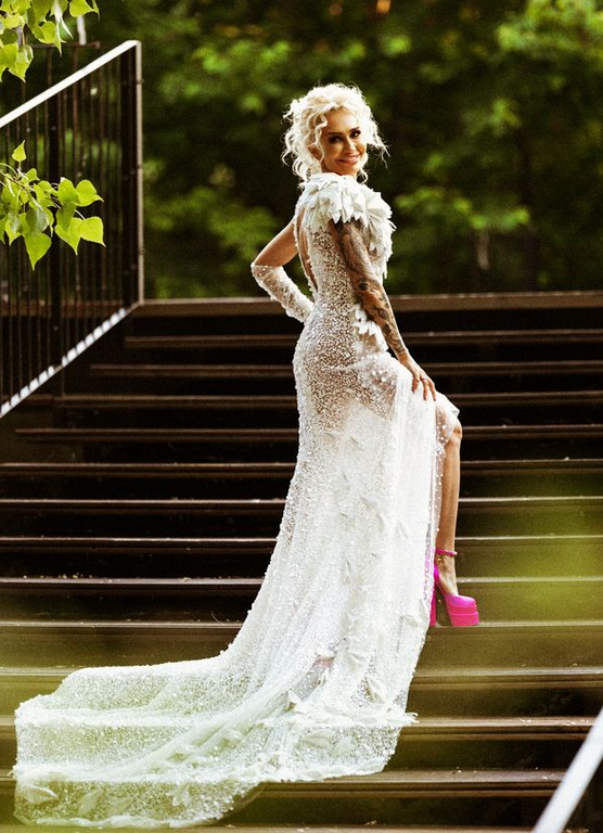 Сватбата бе вечерна навън, а булката смени две бели рокли, едната от които подарък от нейната етърва дизайнерката Кремена Халваджиян.