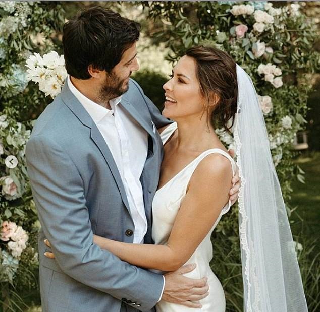 40-годишната брюнетка изглеждаше зашеметяващо в елегантна копринена булчинска рокля, до момента в който позираше дружно с новия си брачен партньор пред огромна флорална декорация.
