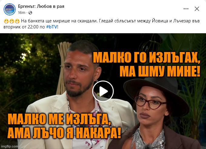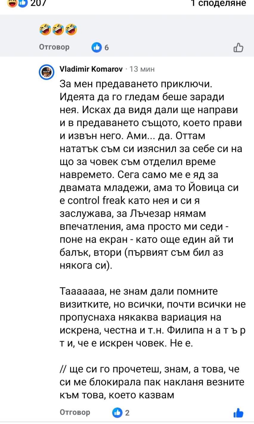 „ Исках да видя дали Филипа ще направи и в предаването същото, което прави и отвън него. Ами... да. Оттам нататък съм си изяснил за себе си на що за човек съм отделил време преди време. Сега единствено ме е гняв за двамата младежи, но то Йовица си e control freak като нея и си я заслужава. За Лъчезар нямам усещания, но просто ми седи - най-малко на екран - като още един IT балък - втори (първият съм бил аз в миналото си).