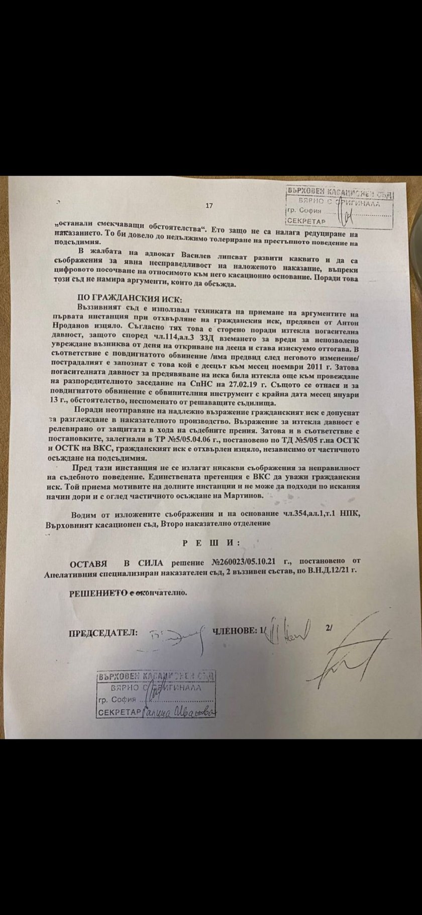 Факсимиле от решението на ВКС