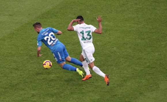 След половин час игра благополучен рикошет остави Дзюба самичък против Городов, само че той заложи на силата и вратарят избави. Секунди по-късно Милад Мохамади блъсна в тил Мак и съдията Сергей Карасьов отсъди дузпа. Тя бе първа за Зенит през сезона, а Маркизио майсторски е осъществя и означи втория си гол с небесносиния екип.