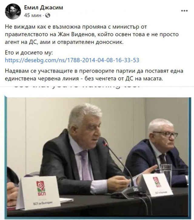 „ Не виждам по какъв начин е допустимо смяна с министър от държавното управление на Жан Виденов, който също така е не просто сътрудник на Държавна сигурност, ами и непоносим клеветник “, написа Джасим и ползва линк.