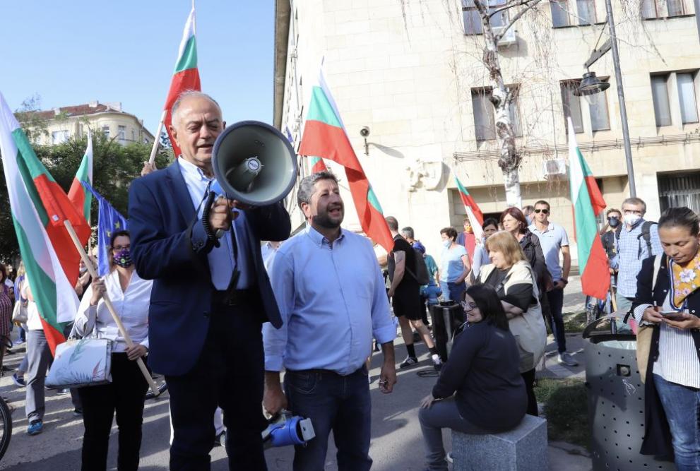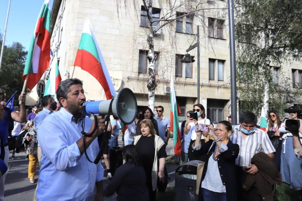 БГНЕС Лидерът на АБВ подвигна афиш с колажи от фотоси на Борисов, с който в предходния мандат подписа съглашение за съдружно ръководство. Заедно с него на митинга да изиска оставка на кабинета пристигна и предприемачът Сашо Дончев с цигара в ръка.