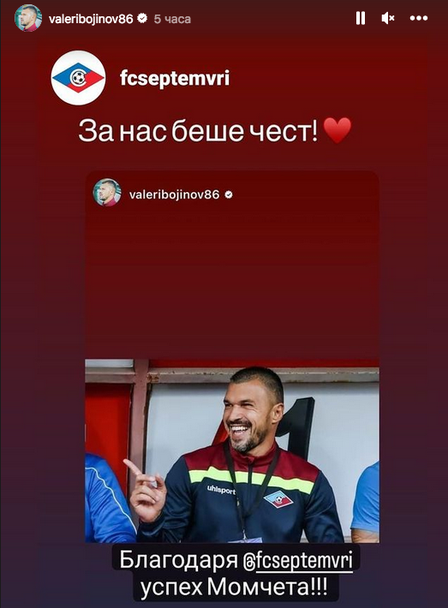 Бившият национал Валери Божинов към този момент не е част от Септември. 36-годишният нападател показа в обществените мрежи, че се е разделил със столичния клуб.