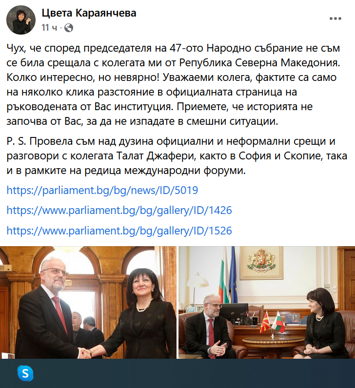 Чух, че съгласно ръководителя на 47-ото Народно заседание не съм се била срещала с сътрудника ми от Република Северна Македония. Колко забавно, само че погрешно! Уважаеми сътрудник, обстоятелствата са единствено на няколко клика разстояние в формалната страница на ръководената от Вас институция. Приемете, че историята не стартира от Вас, с цел да не изпадате в смешни обстановки.