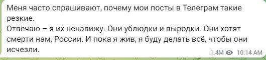" Често ме питат за какво постовете ми в Telegram са толкоз сурови. Отговорът е, че ги ненавиждам. Те са копелета и мръсници. Те желаят гибел за нас, за Русия. И до момента в който съм жив, ще направя всичко допустимо те да изчезнат ", се споделя в обявата.
