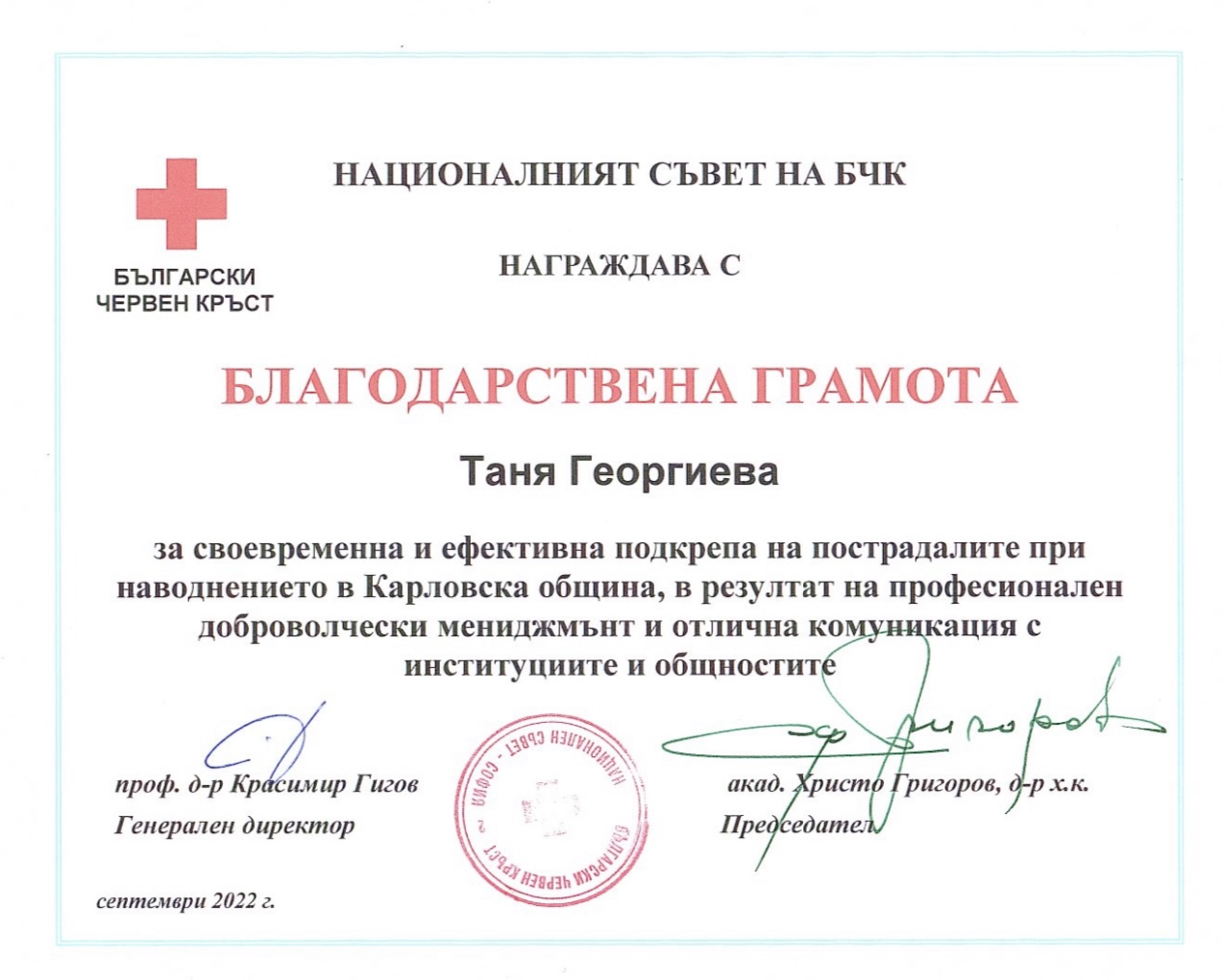 Благодарствена грамота за своевременна и ефикасна поддръжка на потърпевшите при наводнението в района на Карлово получи шефът на БЧК-Пловдив Таня Георгиева. Грамотата беше връчена от ръководителя на Български червен кръст акад. Христо Григоров, като тя е вследствие на професионалния и доброволчески мениджмънт и отличната връзка с институциите и общностите.