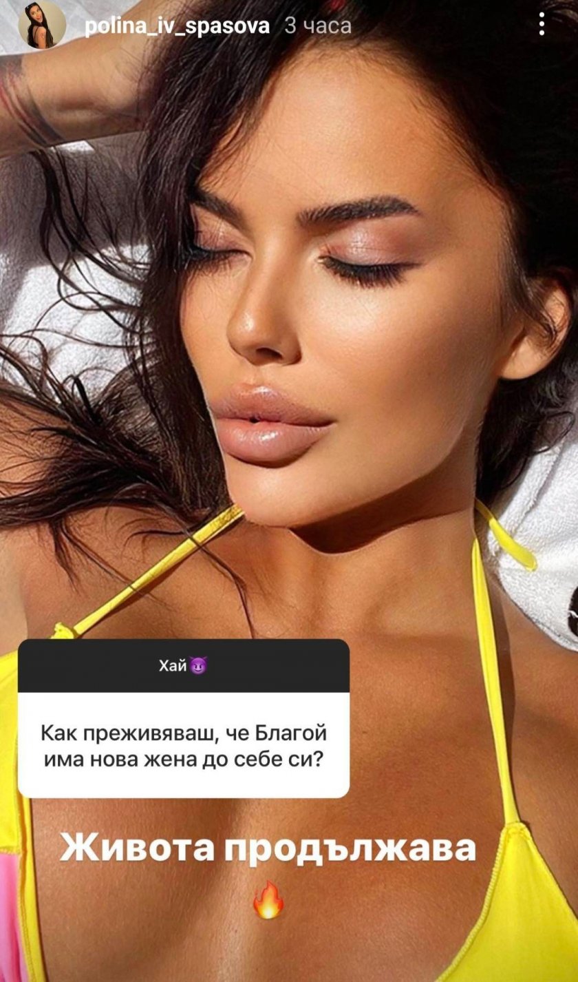 В диалог с почитатели Полина за първи път отговори на въпроса: " Как се чувстваш, откакто Благой има нова жена до себе си? " " Животът продължава ", отвърна към този момент някогашната му, която още веднъж удостовери решимостта си да постави завършек на брака, продължил една година. Тя е безапелационна, че двамата остават в естествени връзки, само че никой не й има вяра.