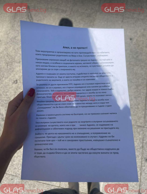 Диляна Николова, другар на фамилията на Адриан, обвиняем за злополуката, при която починаха Ани и Явор, уточни, че събирането им пред Съдебната палата не е митинг. Тя означи, че желаят да желаят да насочат зов към обществото, тъй като в обществените мрежи са се изказали доста неща за Адриан, които нямат общо с истината.