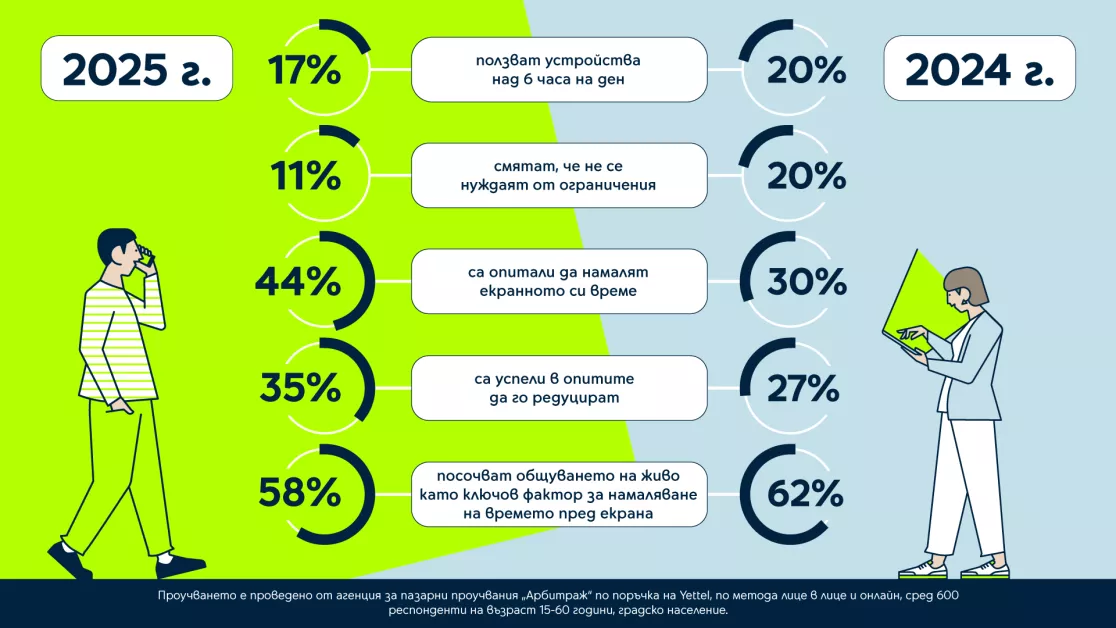 Добрата вест – и успеваемостта пораства. 35% от опиталите през 2025 година споделят, че са съумели да понижат екранното си време, по отношение на 27% година по-рано.