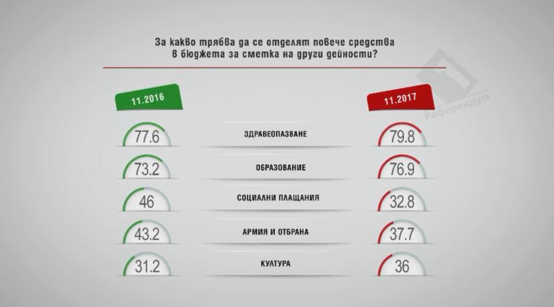 Близо 80 на 100 от интервюираните считат, че в новия бюджет за идната година би трябвало да се отделят повече средства за опазване на здравето, съвсем 77% - за обучение, 33 на 100 - за обществени действия, близо 38% - за войска и защита, а 36% - за просвета.