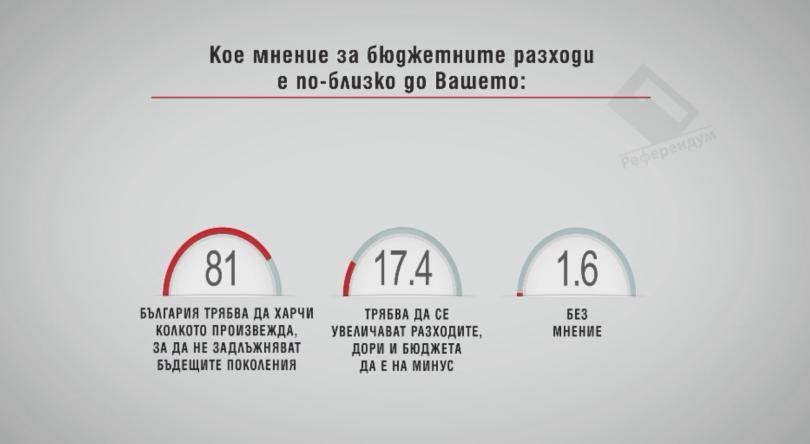 Над 80% от хората считат, че страната ни би трябвало да харчи колкото създава, с цел да нямат отговорности бъдещите генерации, а малко над 17 на 100 - че разноските би трябвало да се усилят, без значение в случай че бюджета е на минус.