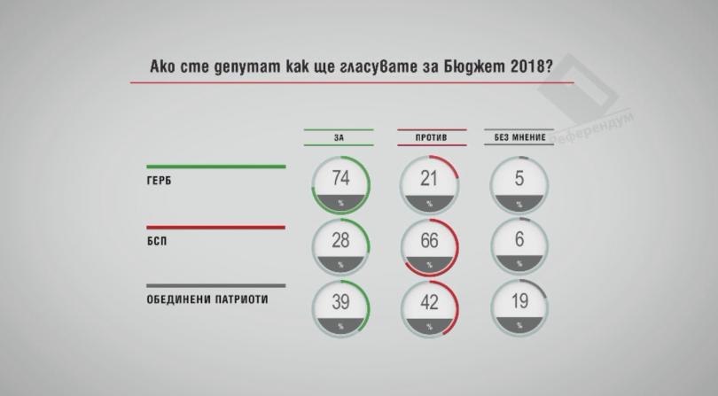 Близо 47% от интервюираните в представителното изследване на " Алфа Рисърч " за предаването " Референдум " считат, че в случай че са депутати ще гласоподават позитивно " ЗА " Бюджет 2018, а малко над 37 на 100 - ще дадат негативен избор.