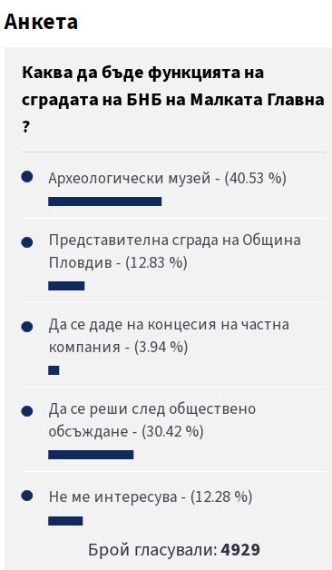 Близо 5 000 души се включиха в анкетата на TrafficNews, в която попитахме пловдивчани в какво да се трансформира постройката на Българска народна банка на ул. " Райко Даскалов ". 40% от гласувалите считат, че тя би трябвало да бъде превърната в музей, в който да бъде показана историята на града. Други 30% са на мнение, че функционалността на постройката би трябвало да се реши след необятен публичен спор. 12,83 % желаят архитектурният монумент да бъде представителна постройка на Община Пловдив. По-малко от 4% са тези, които поддържат мнението, че архитектурният шедьовър би трябвало да бъде даден на концесия на частна компания.