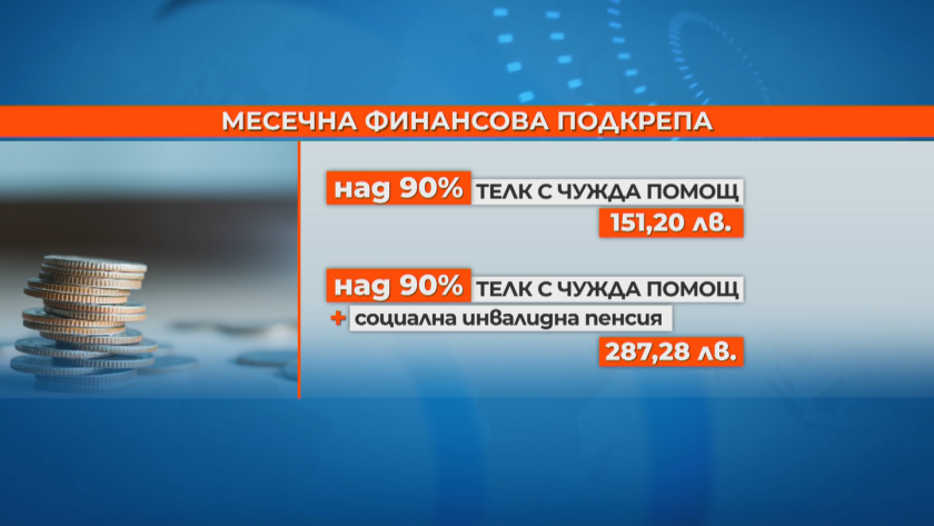 Съпругът на Силвия е с по-тежки увреждания от нея и получава малко по-голяма месечна финансова поддръжка. Помощта е обвързана с линията на беднотия и е увеличена с 22% от началото на тази година. За Силвия това значи близо 23 лв. повече или 126 лв. на месец.