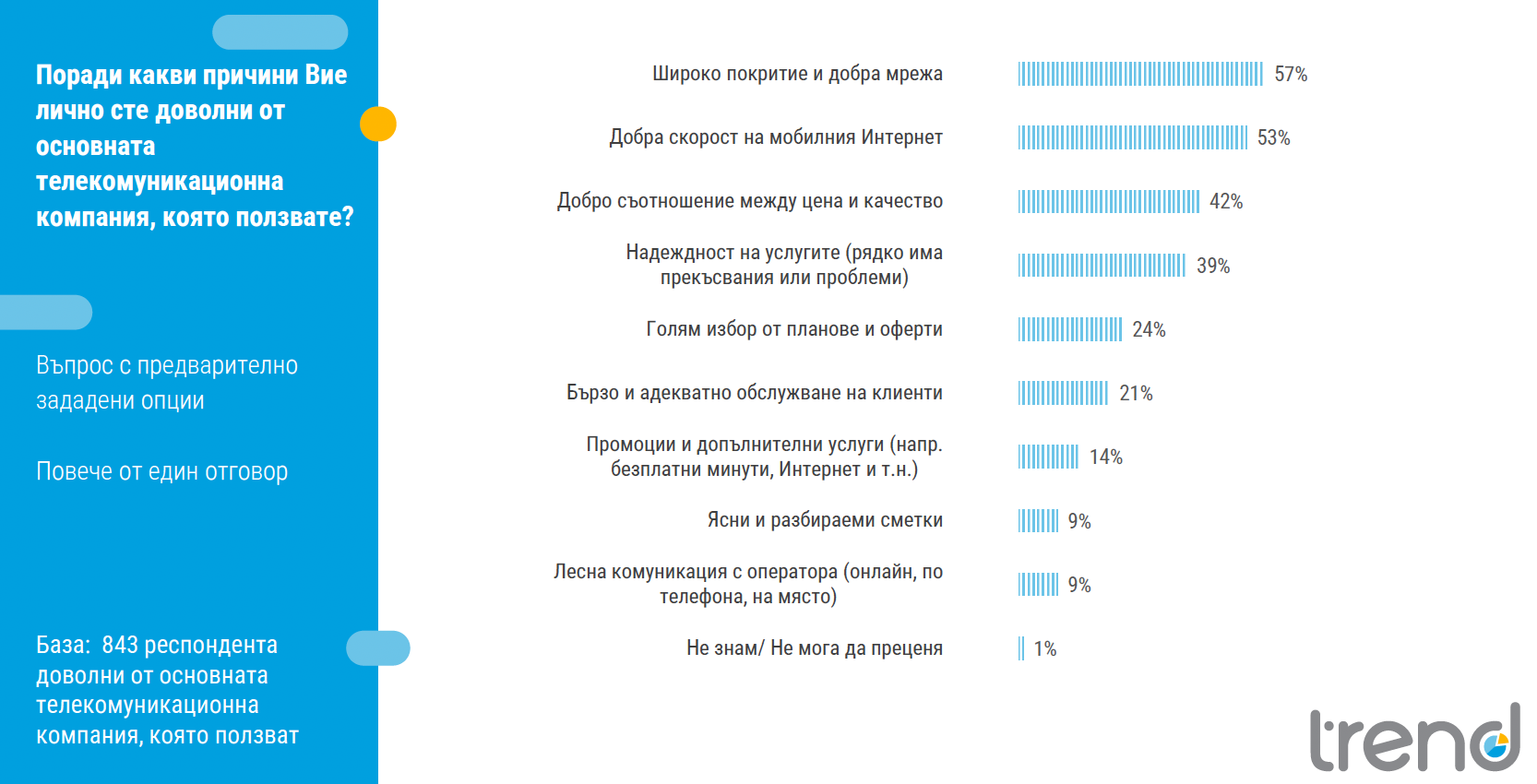 Основните аргументи за позитивната оценка са необятното покритие на мрежите (посочено от 57% от респондентите) и положителната скорост на мобилния интернет (53%). Съотношението сред цена и качество е водещ претекст за 42% от хората, а надеждността на услугите се прави оценка високо от 39%.