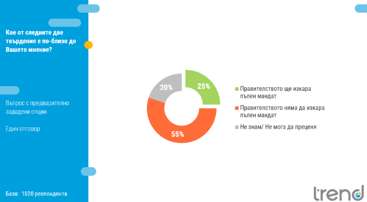 Преобладава чувството, че държавното управление няма да изкара цялостен мандат (55%). Това мнение е по-разпространено измежду гласоподавателите на опозиционните партии, само че се споделя и от към една пета от симпатизантите на ГЕРБ, 4 от 10 от тези на „ Демокрация, права и свободи ", половината от тези на Има Такъв Народ, както и 6 от 10 гласуващи за Българска социалистическа партия.