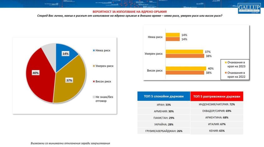 За страдание, няма забележителен спад в страховете от нуклеарна опасност тази година. Две пети от запитаните в този момент виждат висок риск от потреблението на нуклеарно оръжие. Почти същият дял виждат сдържан риск, а единствено 14% не виждат риск. Останалите не могат да отговорят.