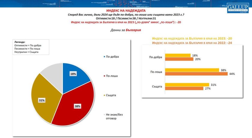Данните от годишното световно проучване на международната Асоциация „ Галъп интернешънъл “ демонстрират, че българите ясно се числят към Запада в своите настроения – по-малко оптимизъм и вяра за разцвет и повече паники за мира и бъдещето.
