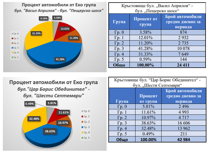 Около 15 000 автомобила от 24 411 автомобила са тъй наречените цапащи с невисок екологичен клас на кръстовищата на булеварди „ Васил Априлов “ и „ Пещерско шосе “.