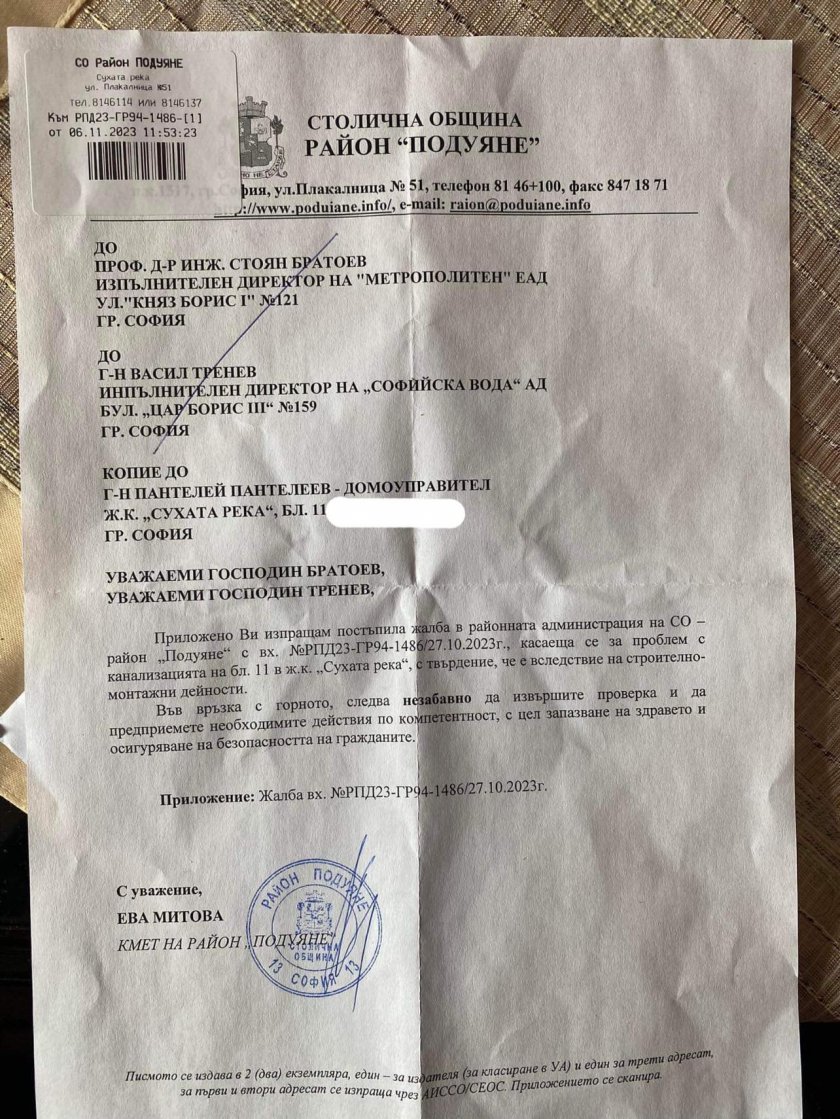 Жалба е подадена навреме от татко ми в ролята му на домоуправител на 27.10.2023 година Има изпратено писмо в тази връзка от кмета на регион Подуяне към Метрополитен ЕАД и Софийска Вода за незабавна инспекция на 06.11.2023 година От тогава насам нищо съответно не е подхванато, с цел да се обезпечи поправката и отводняването от мръсната вода на блока.
